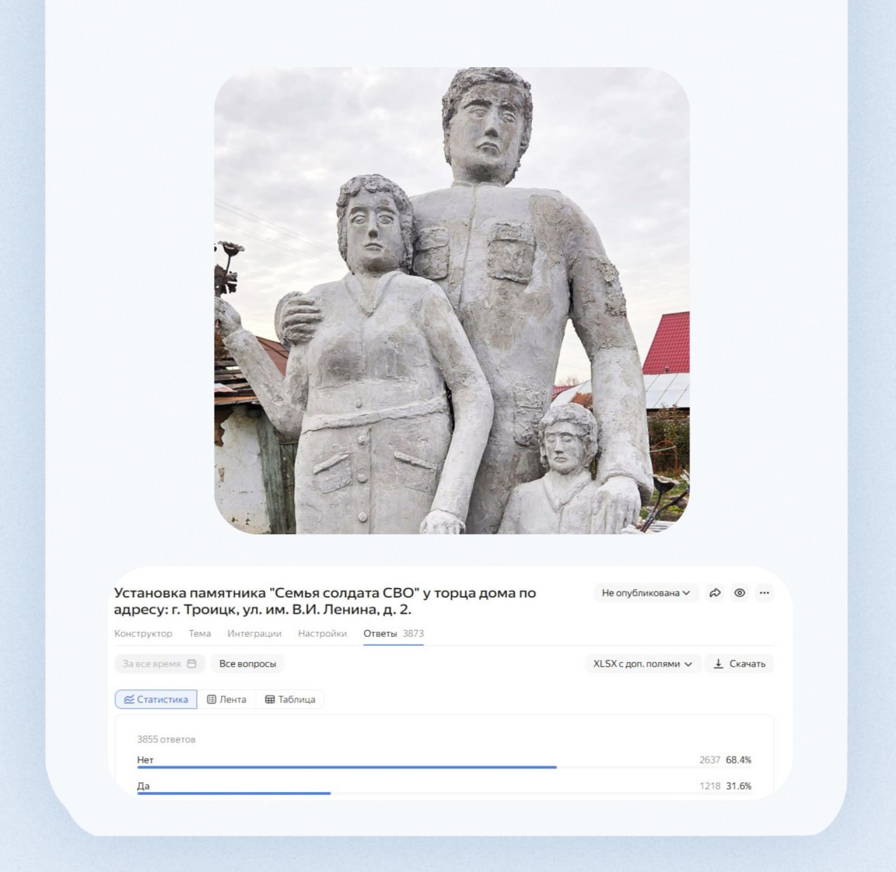 «По итогам опроса большинство троичан высказались против установки памятника. Решение будет учтено при дальнейшей работе над городскими общественными пространствами», – прокомментировали в администрации.