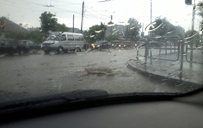 Аналогичная ситуация сложилась и на пересечении Героев Танкограда с улицей Бажова, где из водосточного люка бил фонтан дождевой воды.