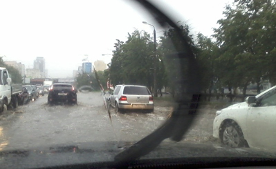 «Под водой оказались четыре полосы магистрали на пересечении улицы Салютная и проспекта Комарово, а также прилегающие газоны и тротуар, вплоть до входа в Сад Победы. Водители вынуждены были объезжать затопленные участки по встречной полосе», – пишет один из свидетелей стихийного потопа в блоге.