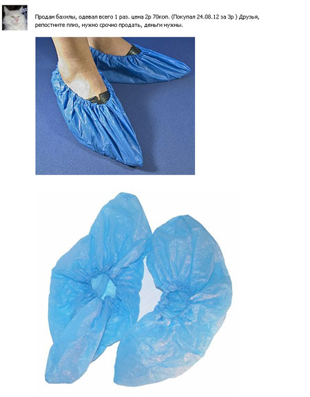 «Продам бахилы, одевал всего 1 раз. цена 2 рублей 70коп. (Покупал 24.08.12 за 3 рублей ) Друзья, репостните плиз, нужно срочно продать, деньги нужны», – пишет парень (орфография автора сохранена. – Прим. АН «Доступ»).