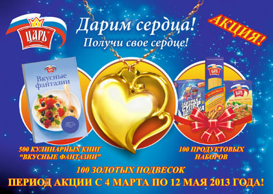 В понедельник, 18 февраля, торговая марка «Царь» (Объединение «СоюзПищепром») объявляет о начале традиционной акции для покупателей «Золотая лихорадка» (до 2012 года – «Весна Великого поста») – и если в 2012 году победители получили 100 золотых корон, в 2013 году счастливчиков наградят сотней золотых подвесок в виде сердца, передает корреспондент Агентства новостей «Доступ».