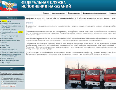 В пресс-службе ГУФСИН по Челябинской области от комментариев по данному вопросу воздерживаются, однако ранее на официальном сайте ведомства (17 декабря 2012 года) было опубликовано сообщение о том, что ИК-25, действительно, исполняет госзаказ. Изготовлением пожарных автоцистерн, согласно пресс-релизу, занимаются заключенные – газоэлектросварщики, токари, маляры, литейщики и другие. Работы проходят в цехе центра трудовой адаптации осужденных.