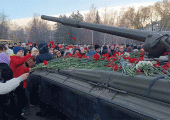 В Копейске люди несут цветы к памятнику «Танк», который городу подарил завод «Пластмасс»