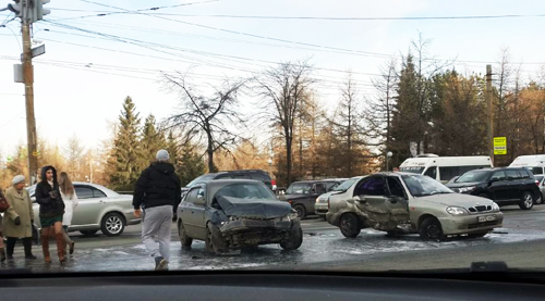 Сегодня, 13 ноября, около 13.30 на пересечении проспекта Ленина и Свердловского проспекта, перед пешеходным переходом, Hyundai Accent залетел в правый бок Chevrolet Lanos, вогнув пассажирскую дверь вовнутрь. Удар был такой силы, что из автомобилей вытекло топливо. Ни водителей, ни людей, находившихся в салонах, на месте не видно.