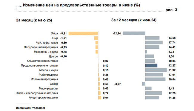 Сильнее всего в июне подорожали кондитерские изделия. Из-за неурожая в основных странах-поставщиках выросла средняя цена какао-бобов на бирже. Это привело к увеличению себестоимости производства шоколада. В результате подорожали шоколад и глазированные шоколадом конфеты. На протяжении года кондитерские изделия преимущественно дорожали, поэтому за 12 месяцев цены на них увеличились существенно – на 14,28%.