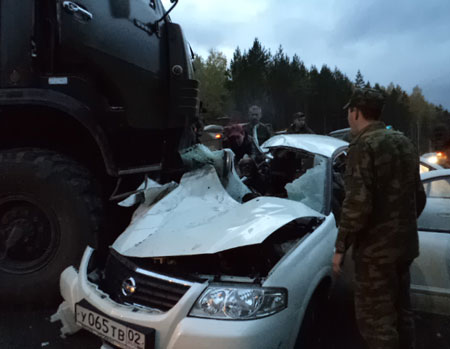 Авария случилась в пятницу, 28 сентября, на 1752 километре М-5. Водитель Nissan Almera при возникновении опасности на дороге выехал на встречку и залетел под колеса КамАЗа, двигавшегося в сторону Уфы в составе военной автоколонны. Легковушку буквально зажевало вместе с находившимися внутри людьми.